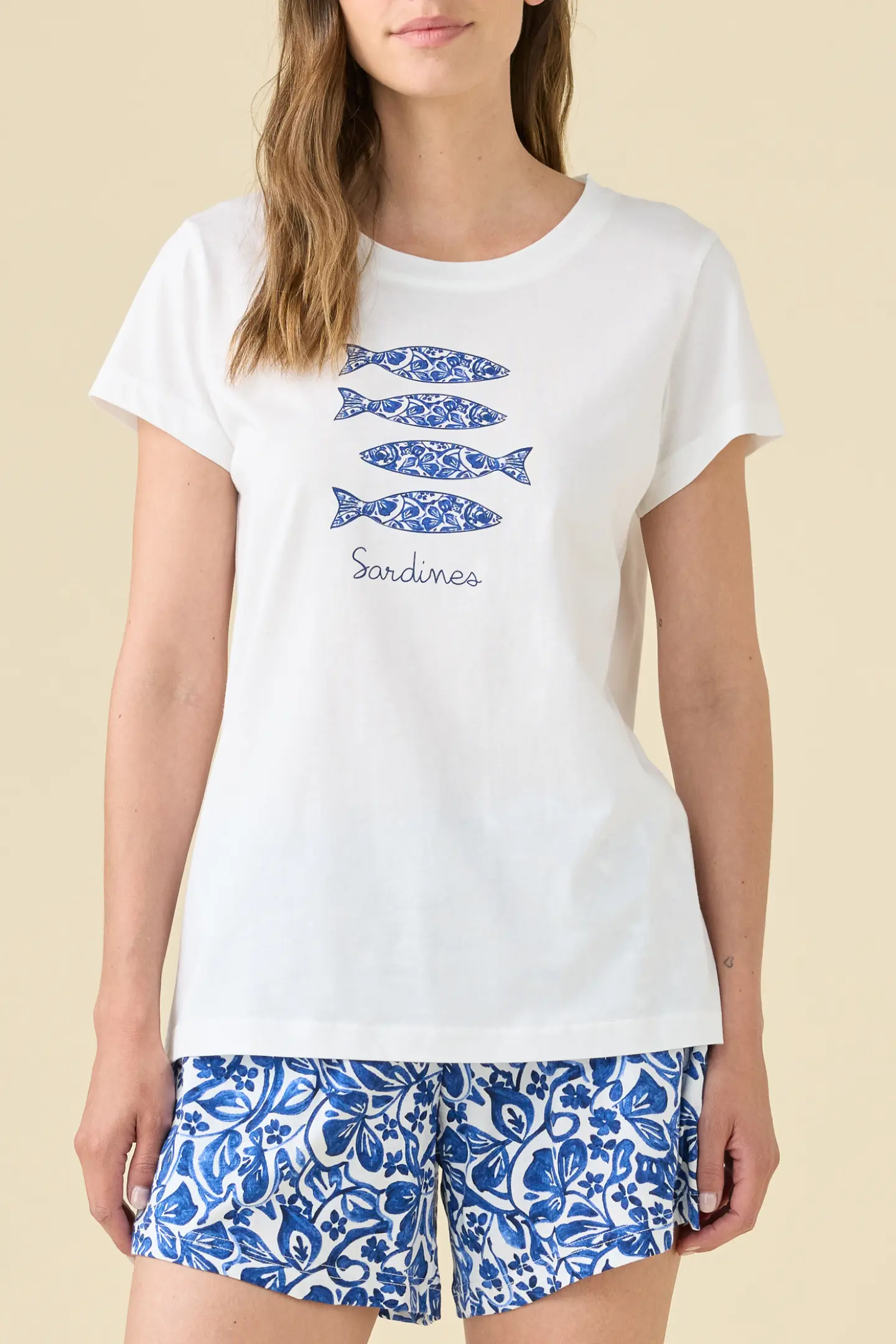 Completo composto da top a manica corta con classico scollo rotondo, abbinato a pantaloncini corti pratici e confortevoli. Il tessuto in puro cotone assicura freschezza, traspirabilità e massimo comfort durante le notti estive. Linea semplice e femminile, perfetta per il relax quotidiano.