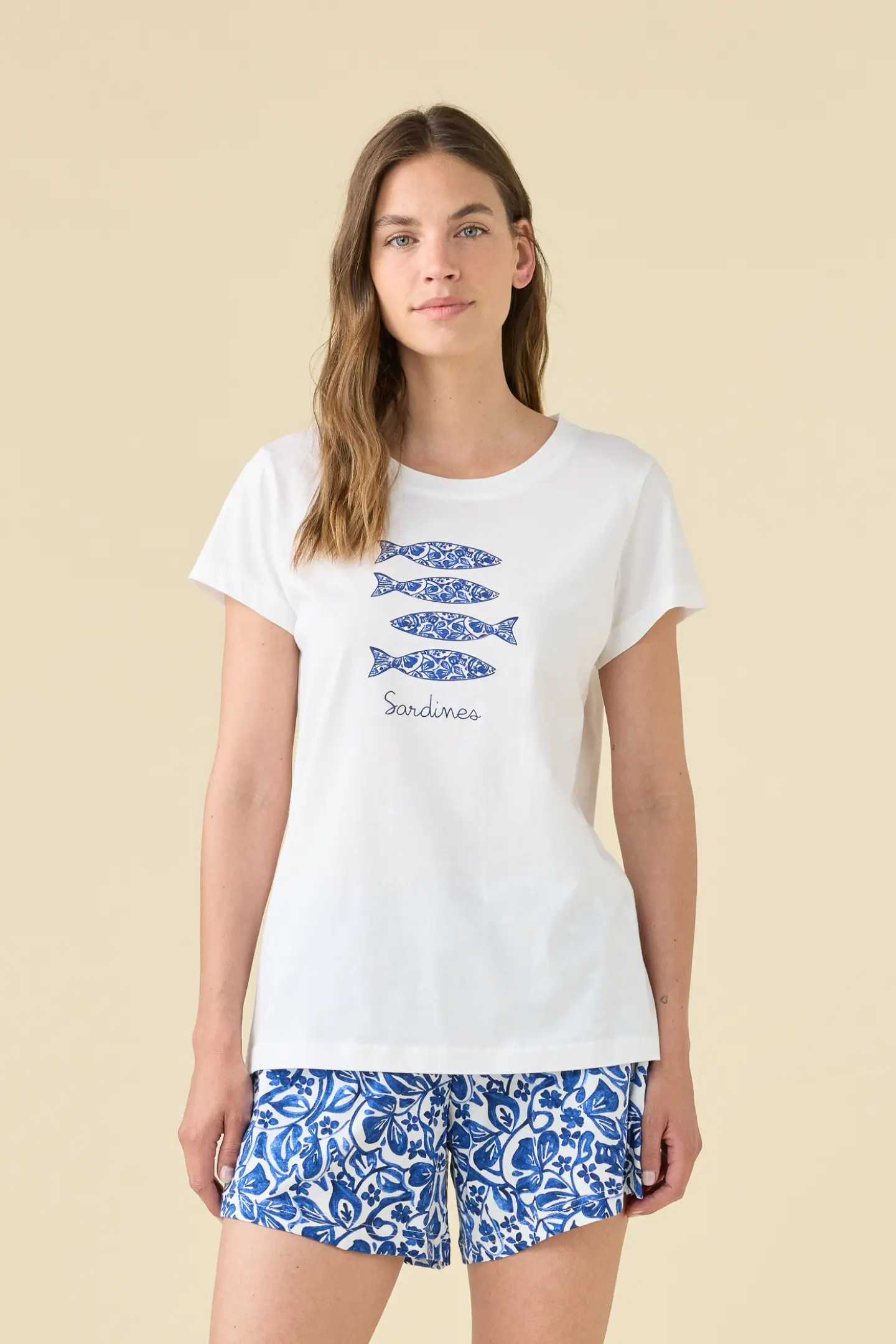 Completo composto da top a manica corta con classico scollo rotondo, abbinato a pantaloncini corti pratici e confortevoli. Il tessuto in puro cotone assicura freschezza, traspirabilità e massimo comfort durante le notti estive. Linea semplice e femminile, perfetta per il relax quotidiano.